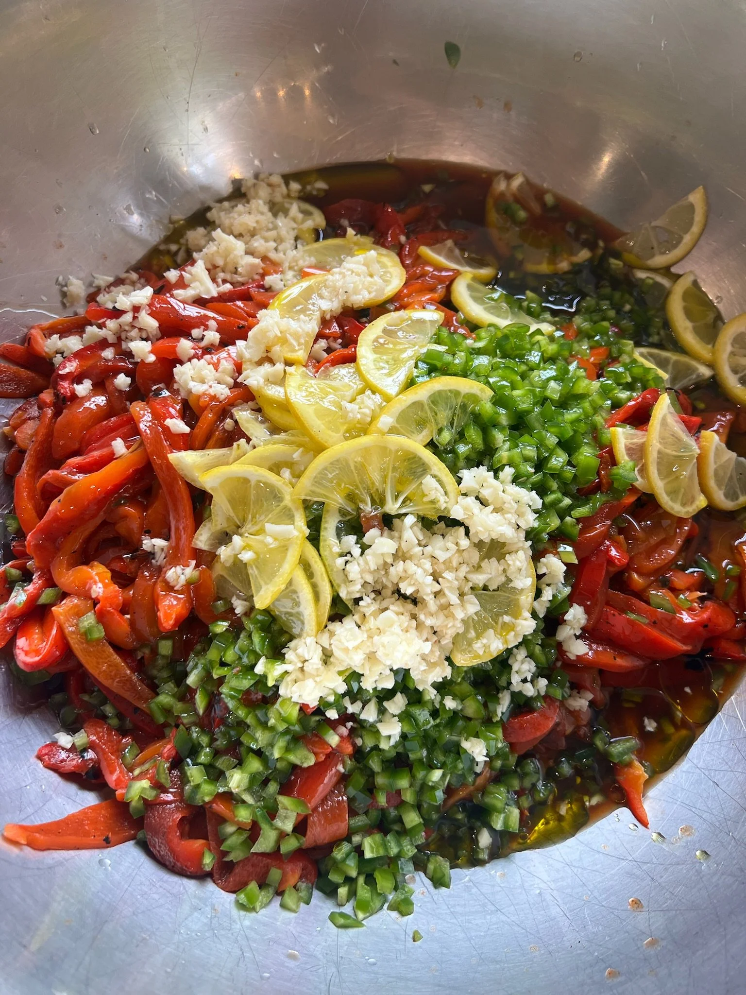 Toss peppers with 2 cloves minced garlic, lemon slices, and 2 minced jalapeños.
